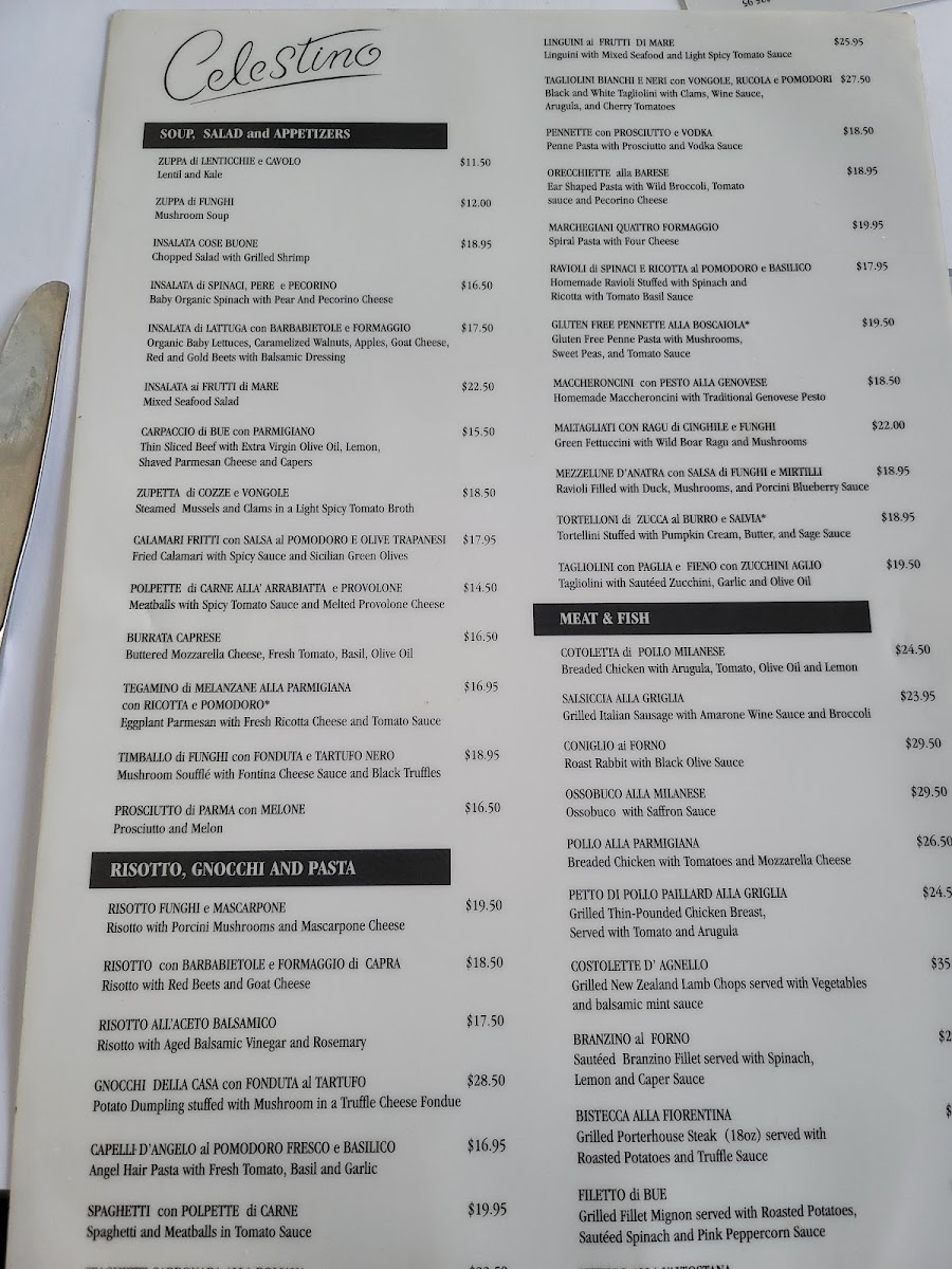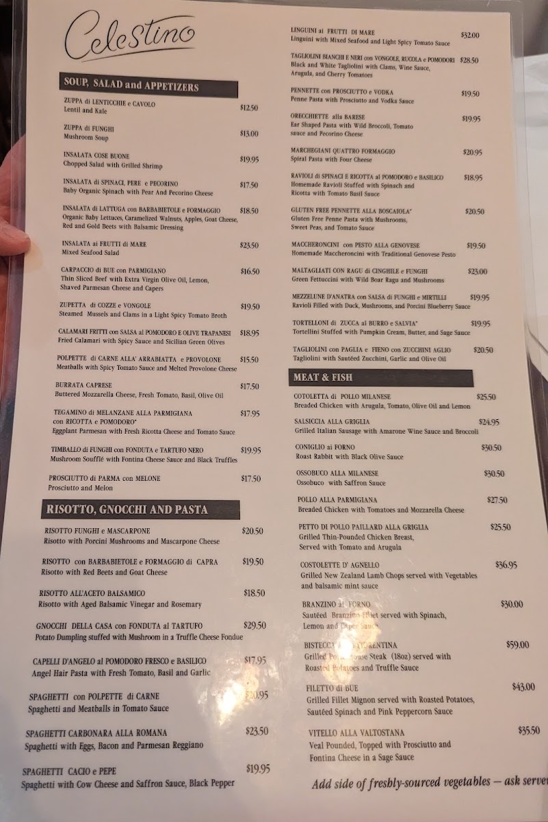 For pasta lovers, Celestino showcases over 20 pasta varieties, including the rich Lasagna with Meat Ragu and the unique Black And White Tagliolini with scallops and saffron. The meat and seafood selection is equally alluring, with options like the succulent Filet Mignon with Barolo Wine and Grilled Veal Chop that speak to true culinary craftsmanship.